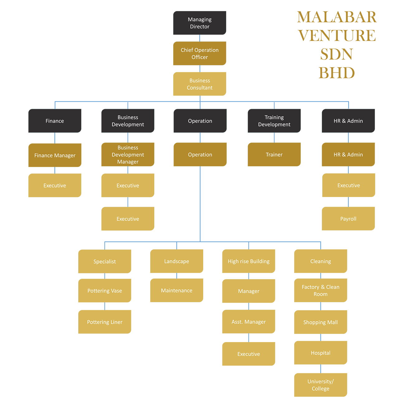Malabar Ventures Sdn. Bhd. (MVSB) was set-up as an manpower outsourcing company in recruiting and managing of foreign worker in 2015. We began to offering full-fledge of cleaning services to customer due to customer demand that push company to diversify its services in 2016. We started off with cleaning services in food and beverages outlets, shopping malls and now we are expanding our services into high rise facade cleaning, classroom cleaning, hygiene service and landscape & ground and maintenance.